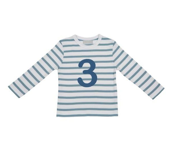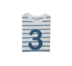 From Bob & Blossom, gorgeous breton striped cotton T shirts, in mid blue and white featuring a blue number screen print.