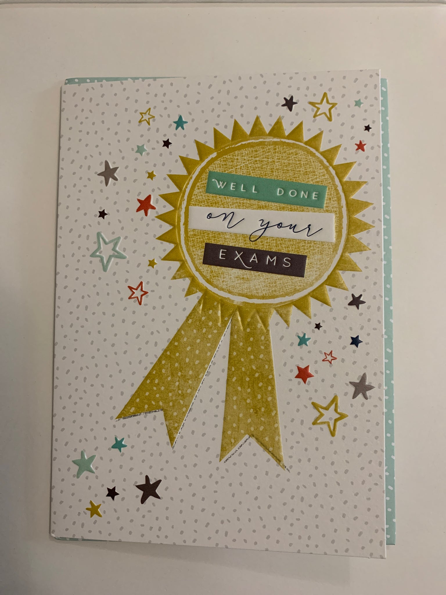 Congratulations card from Laura Darrington Design featuring a gold rosette with the caption “Well Done on your Exams”, all on a lined background. The Halcyon Collection is a stylish range of designs for all occasions. Beautifully embossed and provided with bespoke printed envelopes.